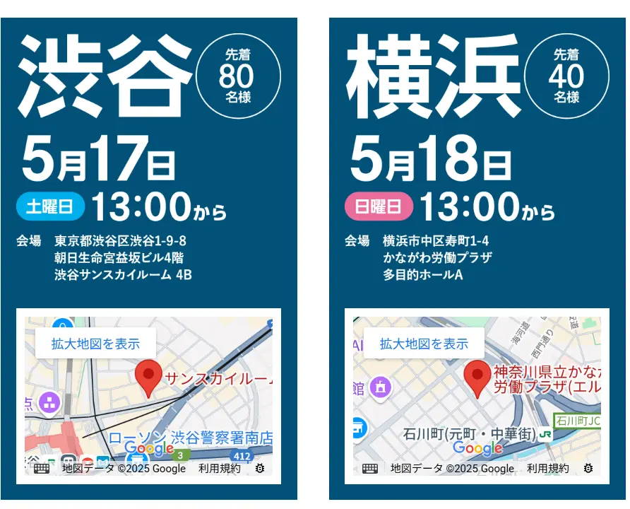 - 日 程:2025年5月17日(土)渋谷会場、5月18日(日)横浜会場
